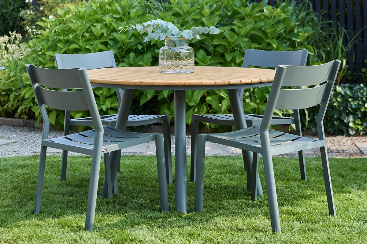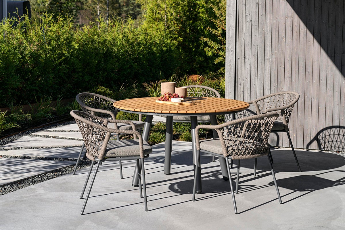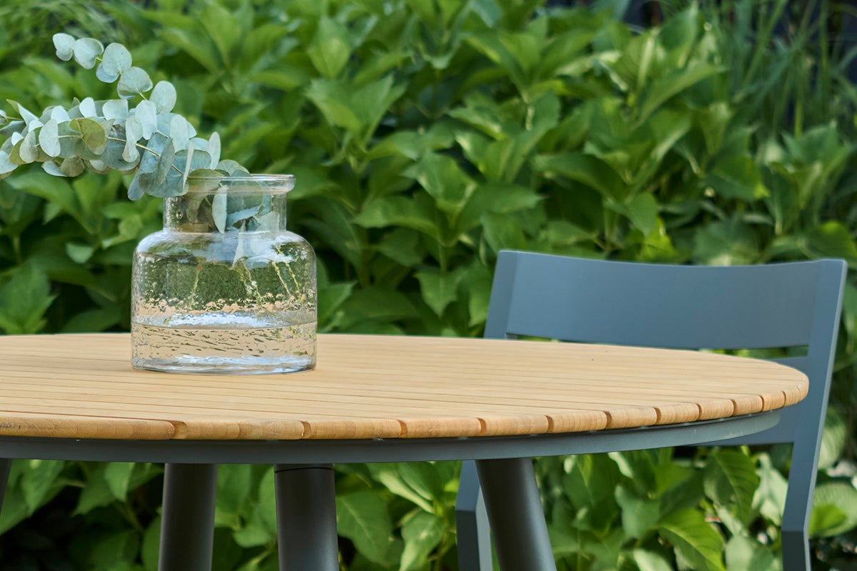 Design und Handwerk in perfekter Harmonie mit dem runden Tisch Bam Bo, ein schönes Beispiel für moderne Eleganz. Generöse, runde Form, die durch schöne Bambusleisten betont wird, alles ruht auf einem Aluminiumgestell mit vier Beinen.