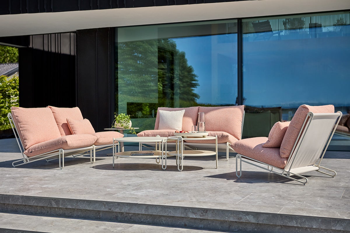 Moderne Loungesofa/Sesselmodule mit Aluminiumgestell und Textilene-Kissen. Bequeme Kissen mit Bezügen aus wasserabweisendem, weichem Olefin. Einladendes Design, vielseitig einsetzbar – als Ein- oder Mehrsitzer in beliebiger Länge. Möglich, von der Seite zu sitzen. Die Tische, die einzeln oder zusammen verwendet werden können, haben eine perforierte Platte, die nicht nur optisch attraktiv ist, sondern auch dafür sorgt, dass das Wasser abläuft.