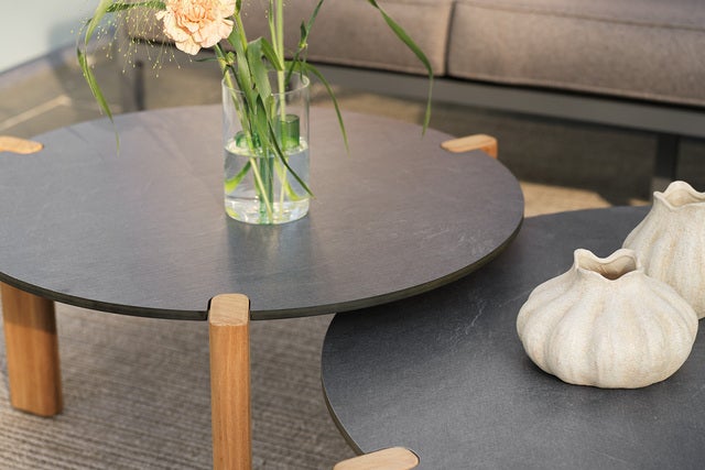 Couchtische in zwei unterschiedlichen Höhen. Die Domino-Tische verleihen einen zusätzlichen Hauch von Eleganz und hochwertigsten Materialien, mit robusten Teakholzbeinen und einer langlebigen Laminatplatte.