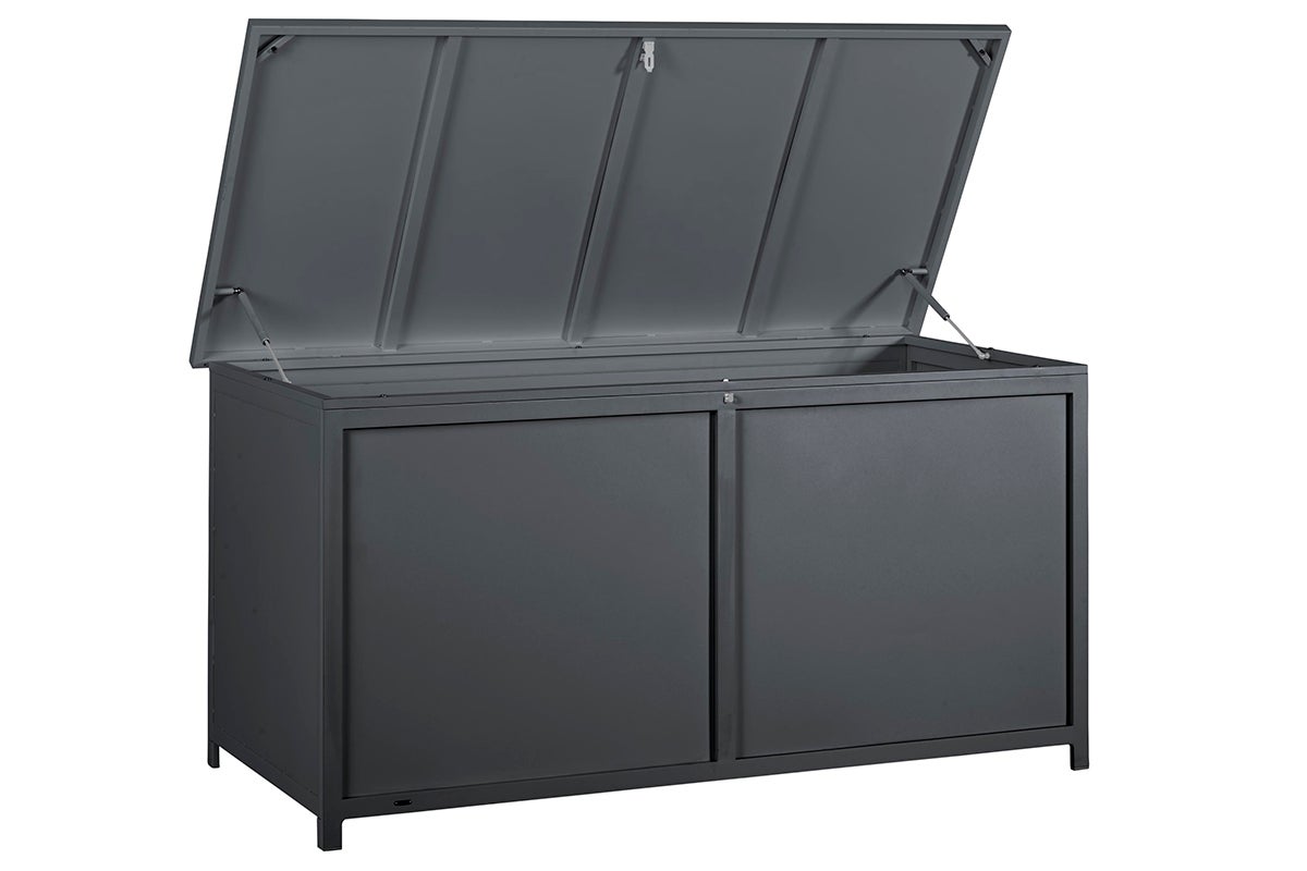 Hide - die Aufbewahrungsbox, die fast alles versteckt. Hergestellt aus Aluminium und in zwei Größen und zwei Farben erhältlich; alle mit einer Verriegelungsfunktion (Vorhängeschloss separat erhältlich), sanftes Öffnen und Schließen dank der Gasfeder und einem stabilen Deckel, der sie als Fläche nutzbar macht.