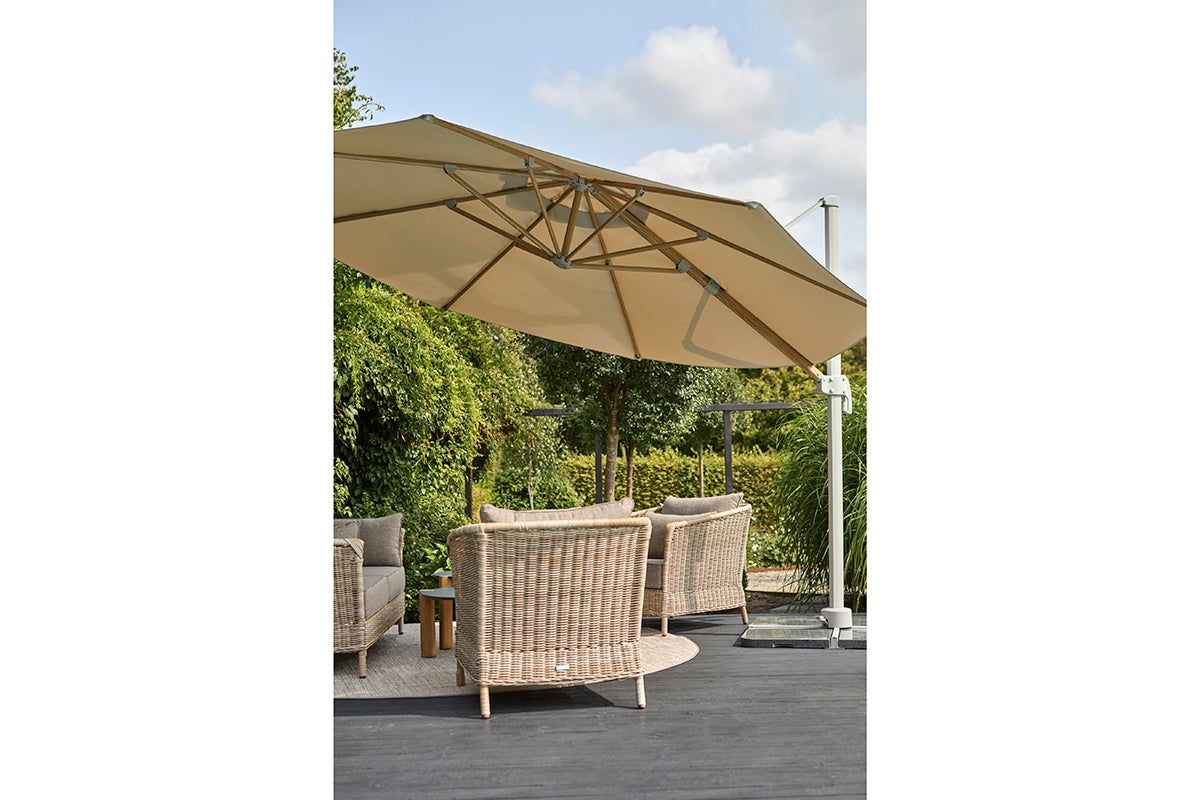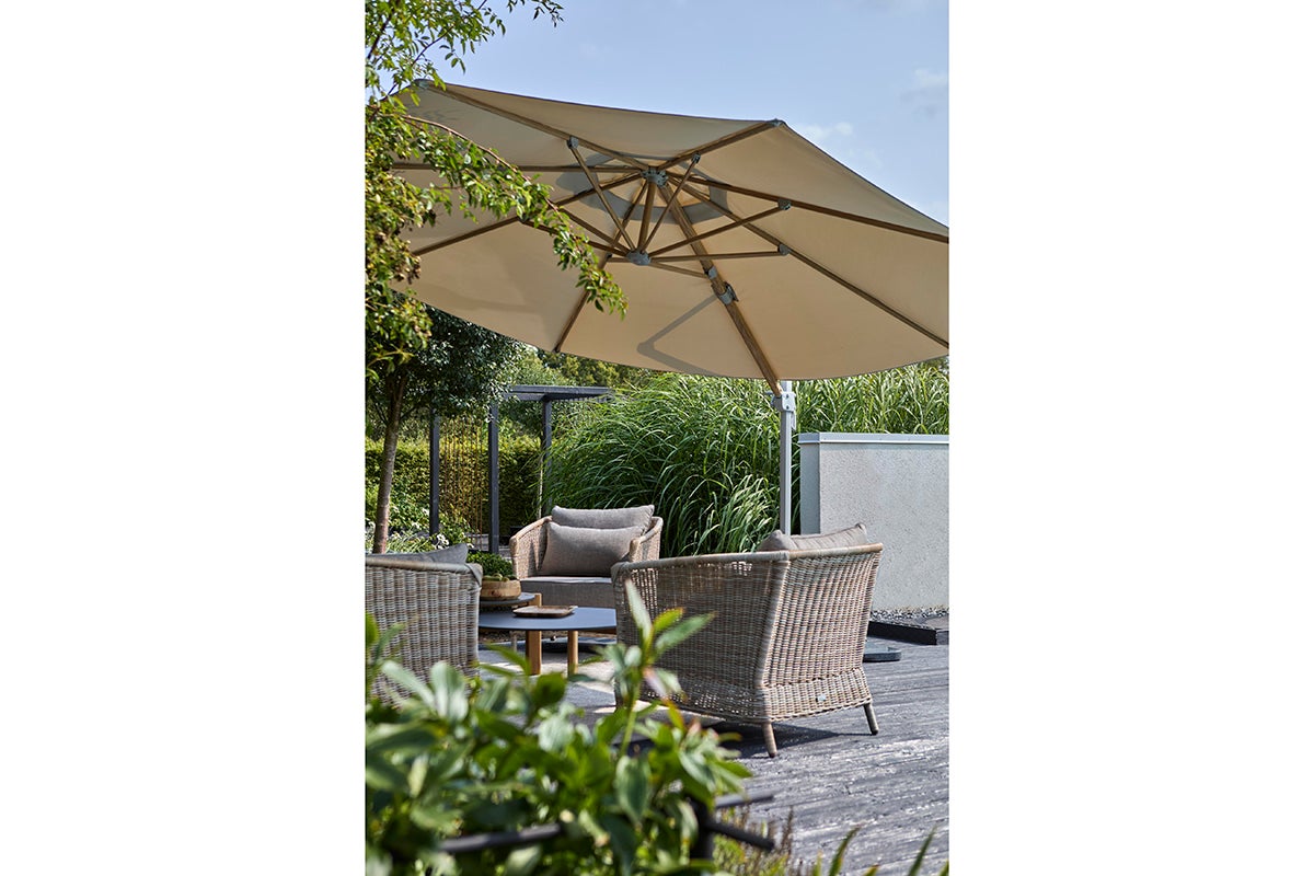 Der Luzzi-Sonnenschirm hat einen Rahmen in dezentem Hellgrau. Die Streben sind mit einem schönen Holz-Muster bedruckt, was ein warmes und einladendes Gefühl vermittelt. Luzzi ist ein freistehender Sonnenschirm mit einem 250 g garngefärbten Polyesterstoff und einem Aluminiumgestell mit Kurbel und stufenloser Steuerung. Die Basis ist enthalten, muss aber mit Sonnenschirmgewichten oder ähnlichem verankert werden.