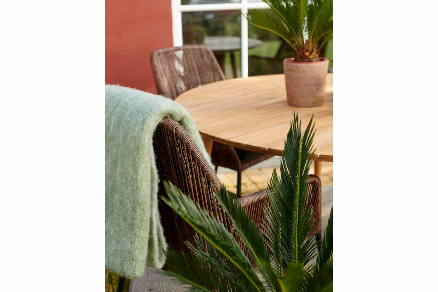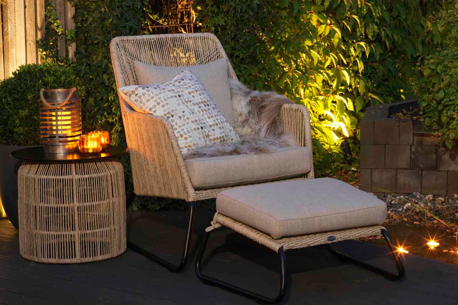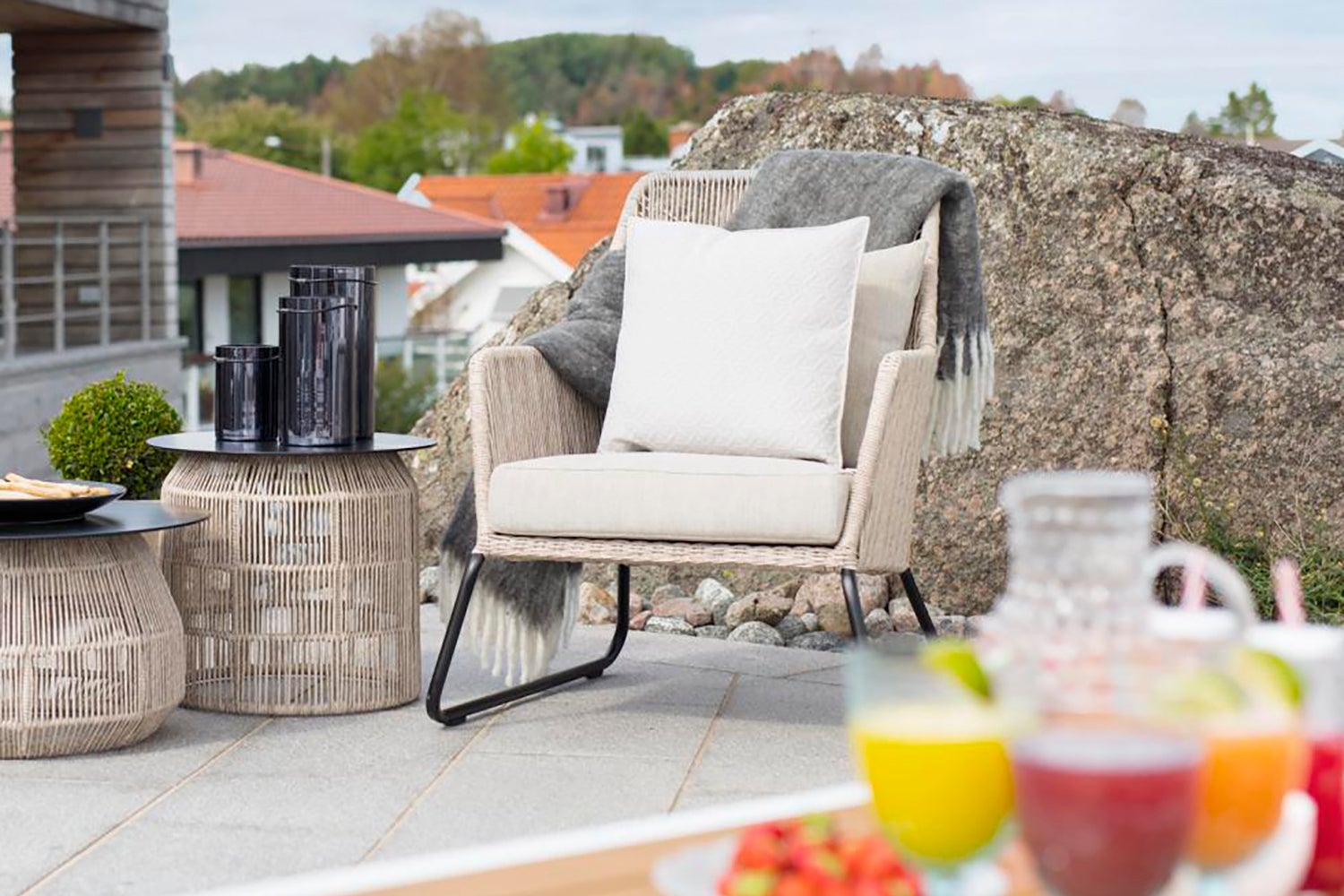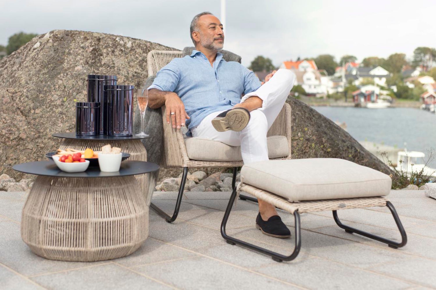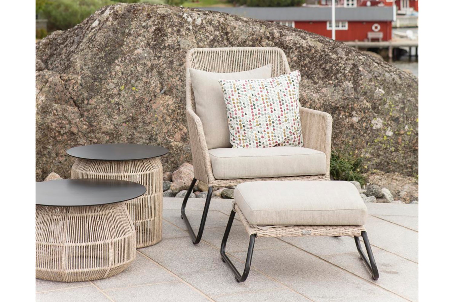 Midway ist eine Serie aus verdrilltem Kunstrattan mit weichen, modernen Formen. Alle Modelle haben einen Aluminiumrahmen und sind aus Kunstrattan handgeflochten. Die Serie umfasst einen Esstischstuhl, einen Sessel, einen Fußhocker und eine Bank. Sofas und Stühle haben Auflagen aus Olefin. In zwei Farben erhältlich.