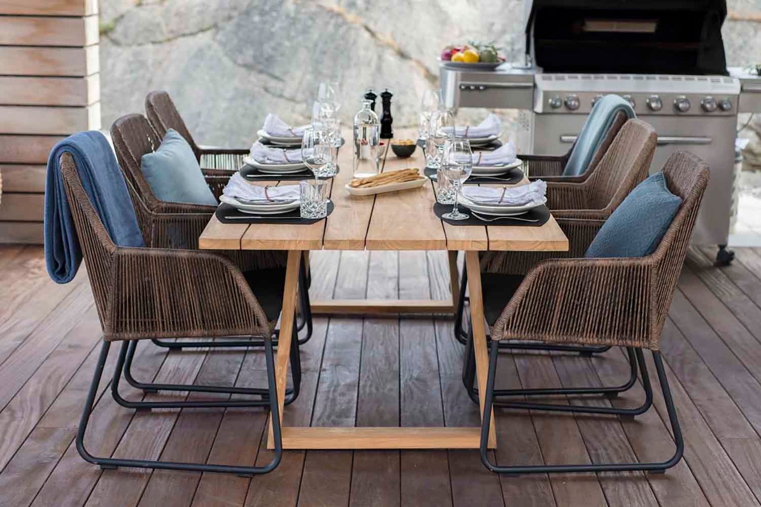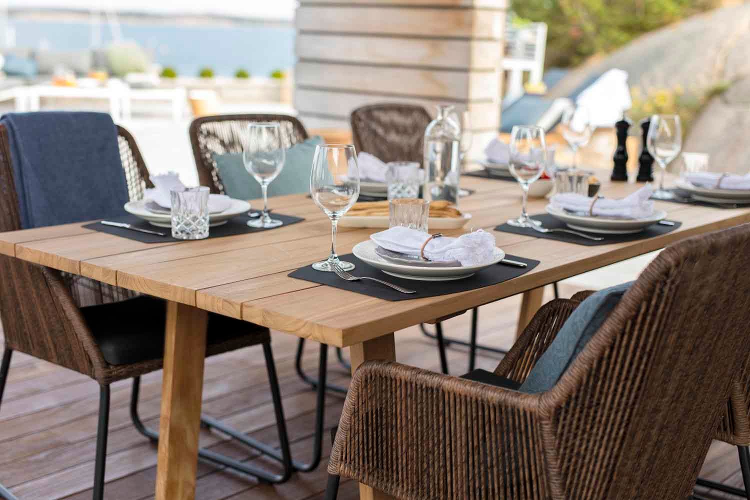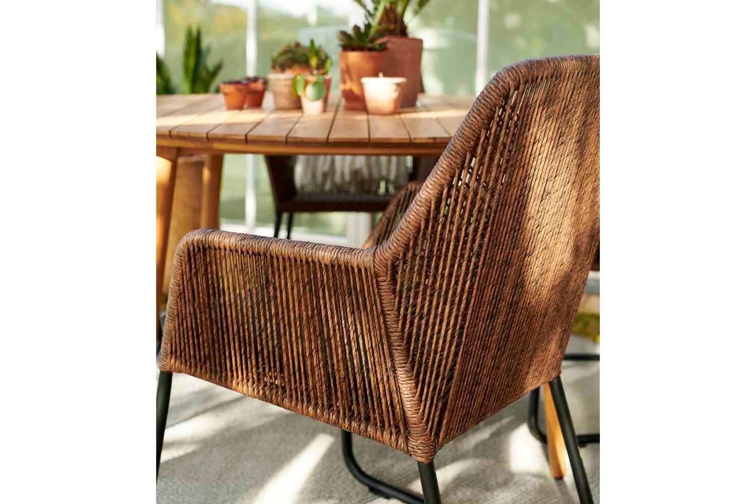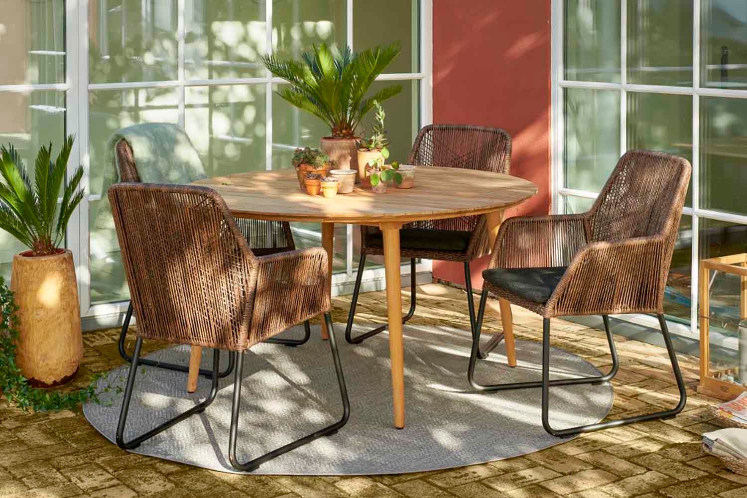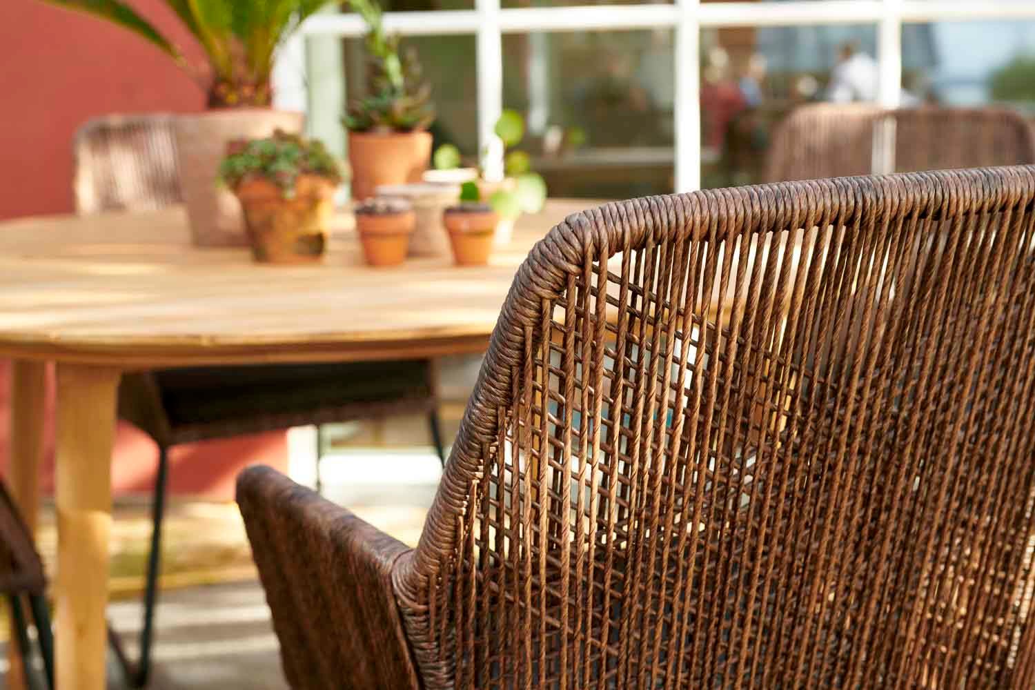 Midway ist eine Serie aus verdrilltem Kunstrattan mit weichen, modernen Formen. Alle Modelle haben einen Aluminiumrahmen und sind aus Kunstrattan handgeflochten. Die Serie umfasst einen Esstischstuhl, einen Sessel, einen Fußhocker und eine Bank. Sofas und Stühle haben Auflagen aus Olefin. In zwei Farben erhältlich.