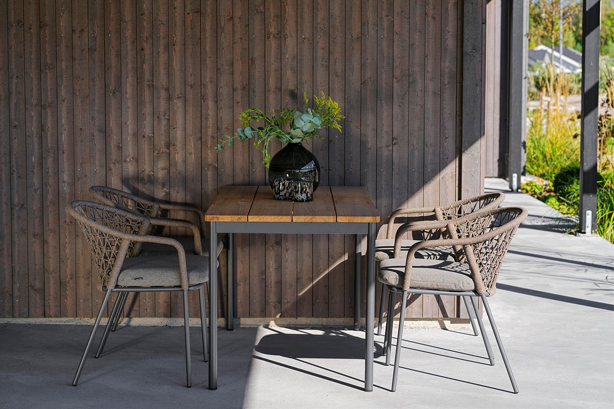 Die Tische der Nox-Serie ermöglichen es Ihnen, einen Esstisch ganz nach Ihrem Geschmack zu gestalten. Wählen Sie entweder einen vormontierten Tisch mit einer Tischplatte aus Teak oder Bambus, oder wählen Sie ein beliebiges Gestell und kombinieren Sie es mit einer Tischplatte aus Laminat, entweder im Betonlook oder im Terrazzo-Stil.