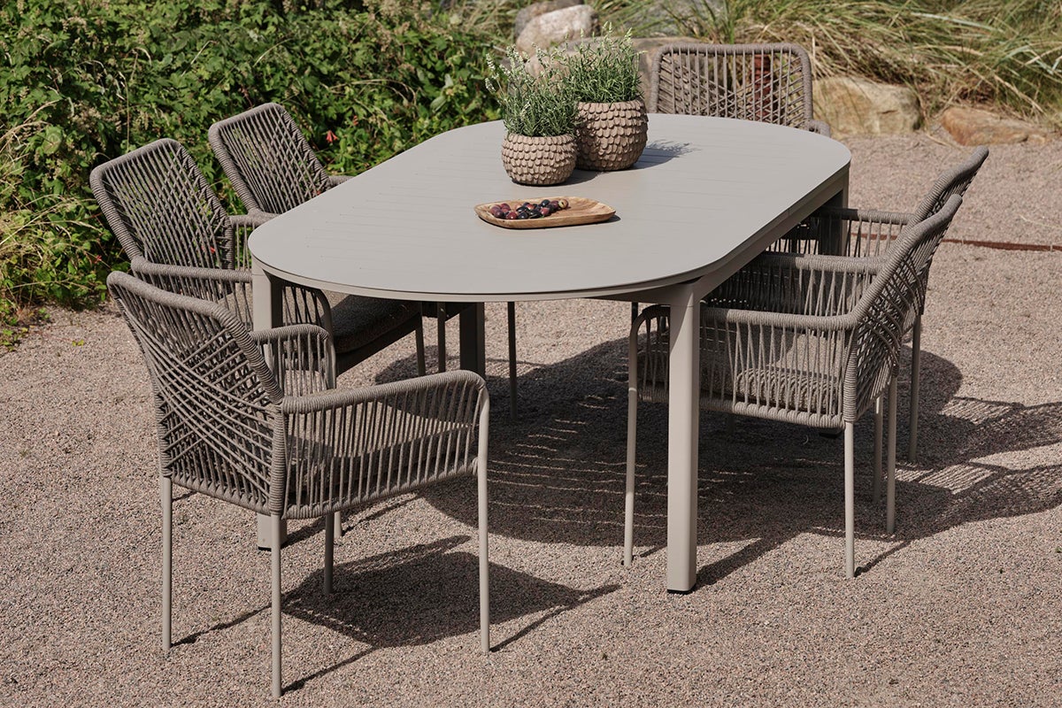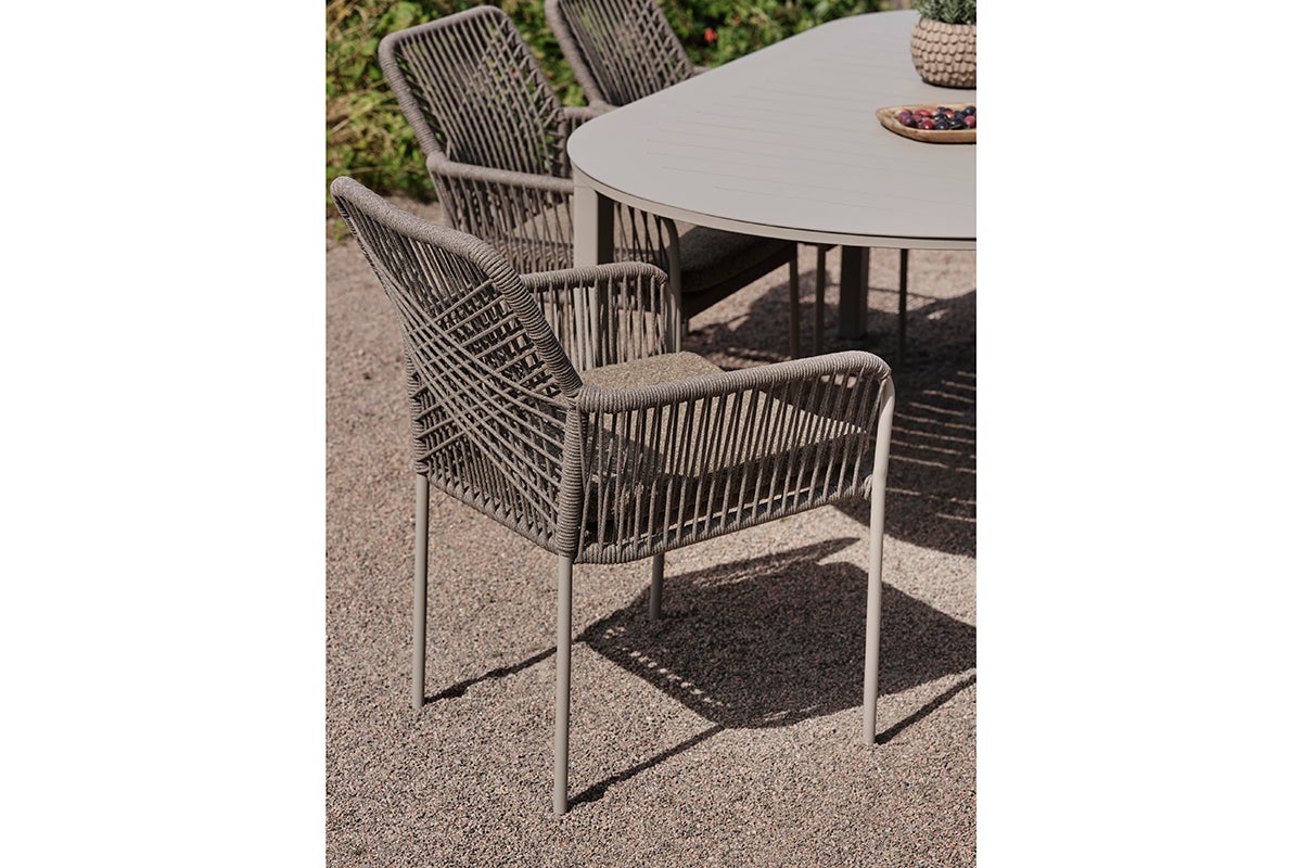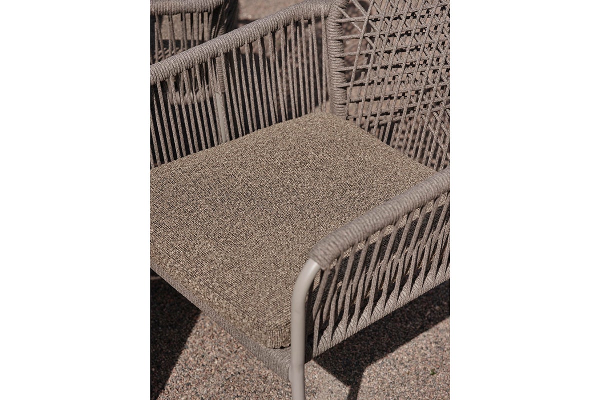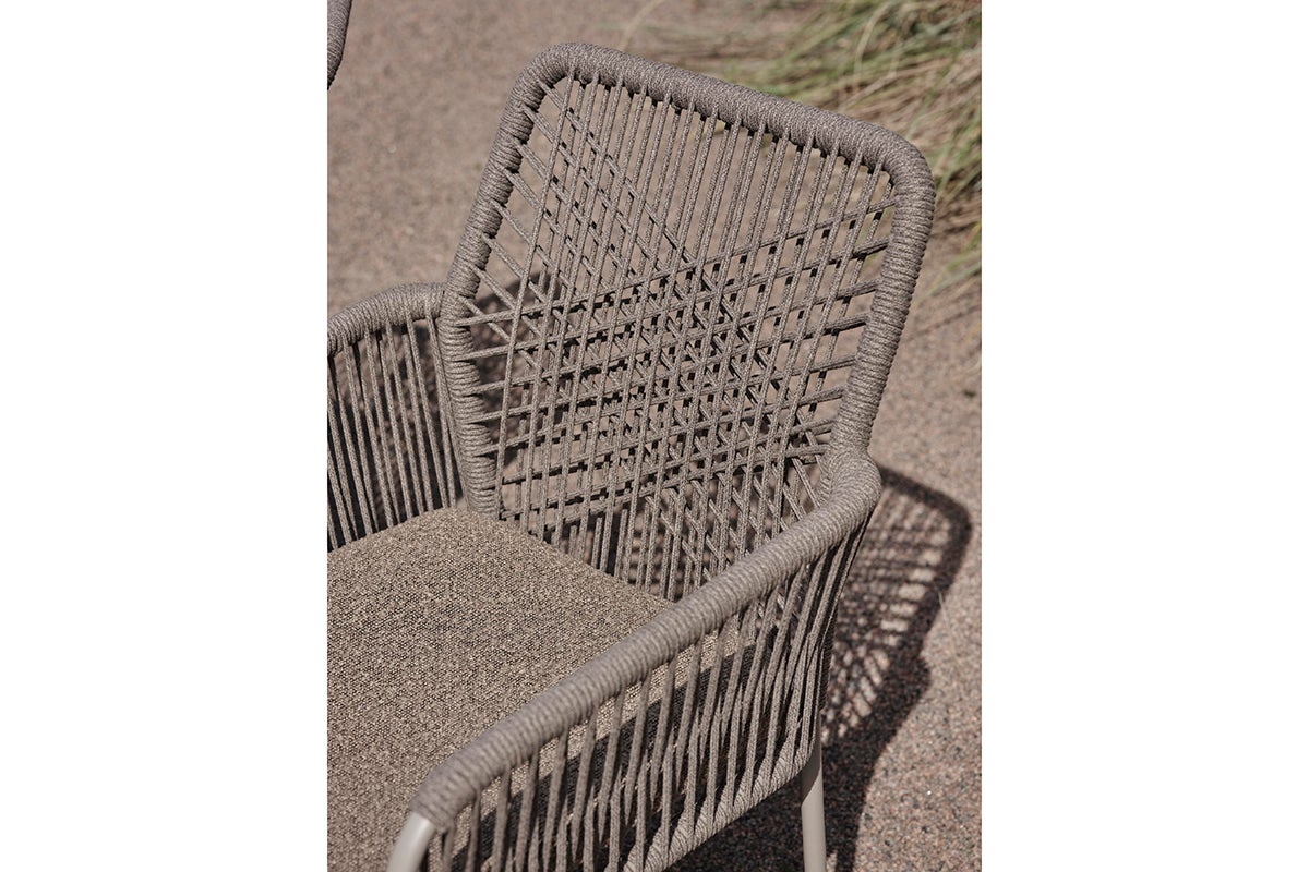 Dieser bequeme Esszimmerstuhl hat ein geflochtenes Seildesign, das Wind und Wetter standhält. Der Stahlrahmen bietet stabile Unterstützung und widersteht Rost und Korrosion, was eine langfristige Nutzung in jedem Klima gewährleistet. Das schön geflochtene Muster auf Sitz und Rückenlehne verleiht ein organisches Gefühl, das durch seine erdigen Töne verstärkt wird und zum Entspannen einlädt. Ein Sitzkissen ist für zusätzlichen Komfort inbegriffen.