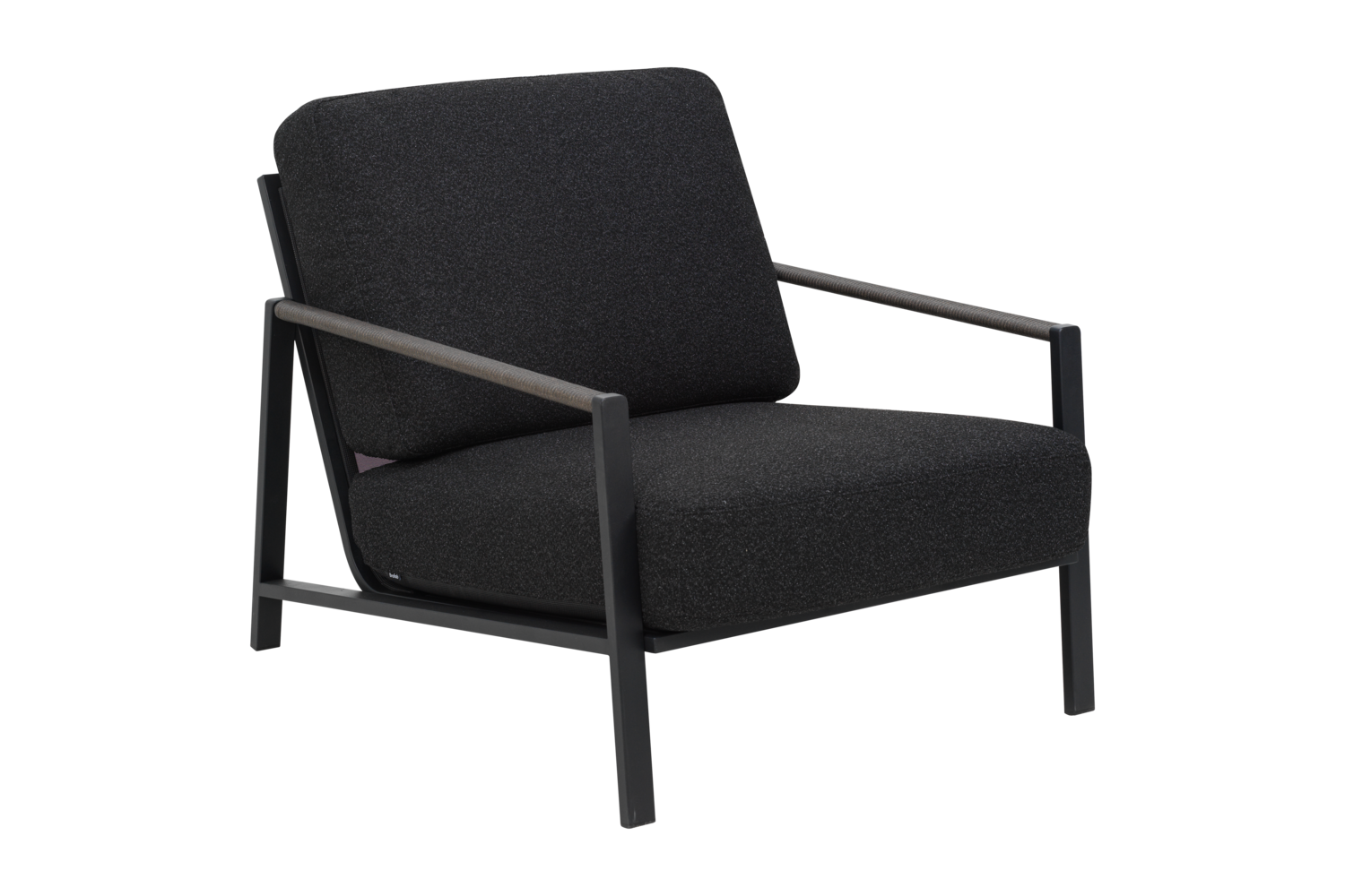 Lyra ist eine moderne und sehr nüchterne Serie in einem schönen Materialmix. Gestell aus schwarz pulverbeschichtetem Edelstahl (304), perfekt für unterschiedliche Wetterbedingungen. Schöne Details aus synthetischem Rattan an den Armlehnen.